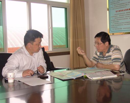 图3:田立智(右)向客人介绍建设与发展情况。