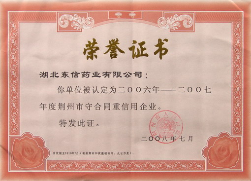 近日,a片漫画 因积极实行合同管理制度,切实加强a片漫画 合同管理,依法开展生产经营,自觉维护市场秩序,在对外经济交往中去得了明显的经济和社会效益,被荆州市人民政府授予“2006—2007年度荆州市守合同重信用a片漫画 ”。