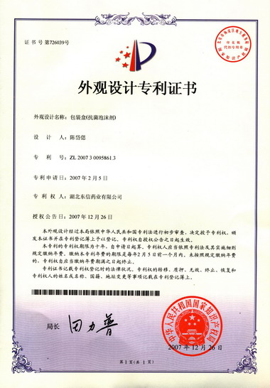 图1:“抗菌泡沫剂”包装盒外观设计专利证书。
