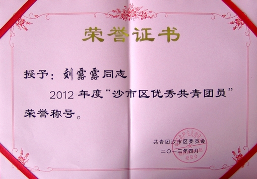2013年4月27日,a片漫画 质量部检验员刘露露被共青团沙市区委授予2012年度“沙市区优秀共青团员”称号。