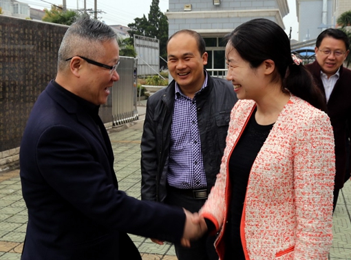 图1:a片漫画 总经理田立智(左)欢迎市妇联主席李静芹(右二)指导工作。