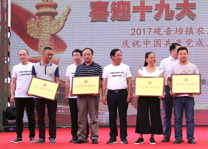 党支部副书记吴家滔(前左二)在镇党委纪念建党96周年大会上领取奖牌。