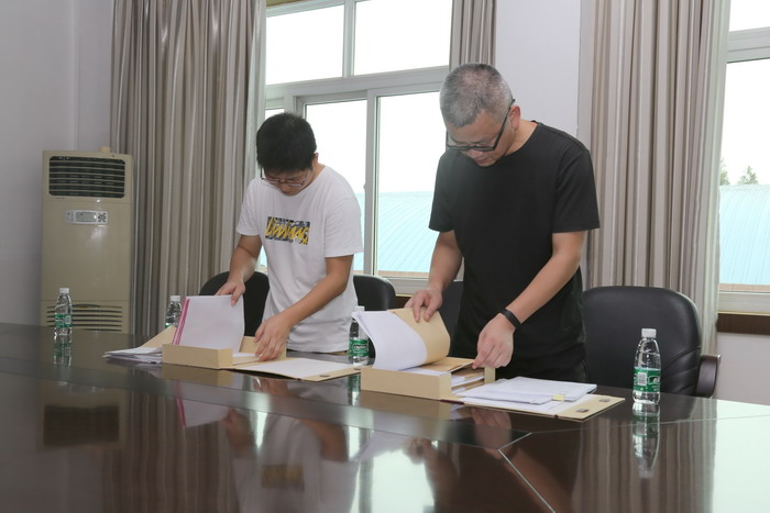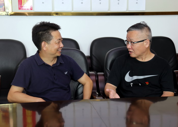 唐华(左)与a片漫画 总经理、党支部书记田立智交流。