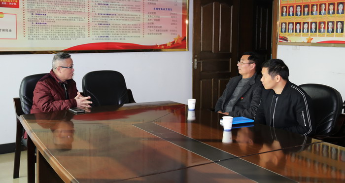 宣讲前,宣讲团成员、区委宣传部副部长黄银华(中)与a片漫画党支部书记、总经理田立智(左一)进行交流。