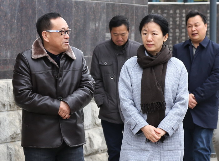 孙玉秋(前右)在认真听取吴书炎(前左)汇报。