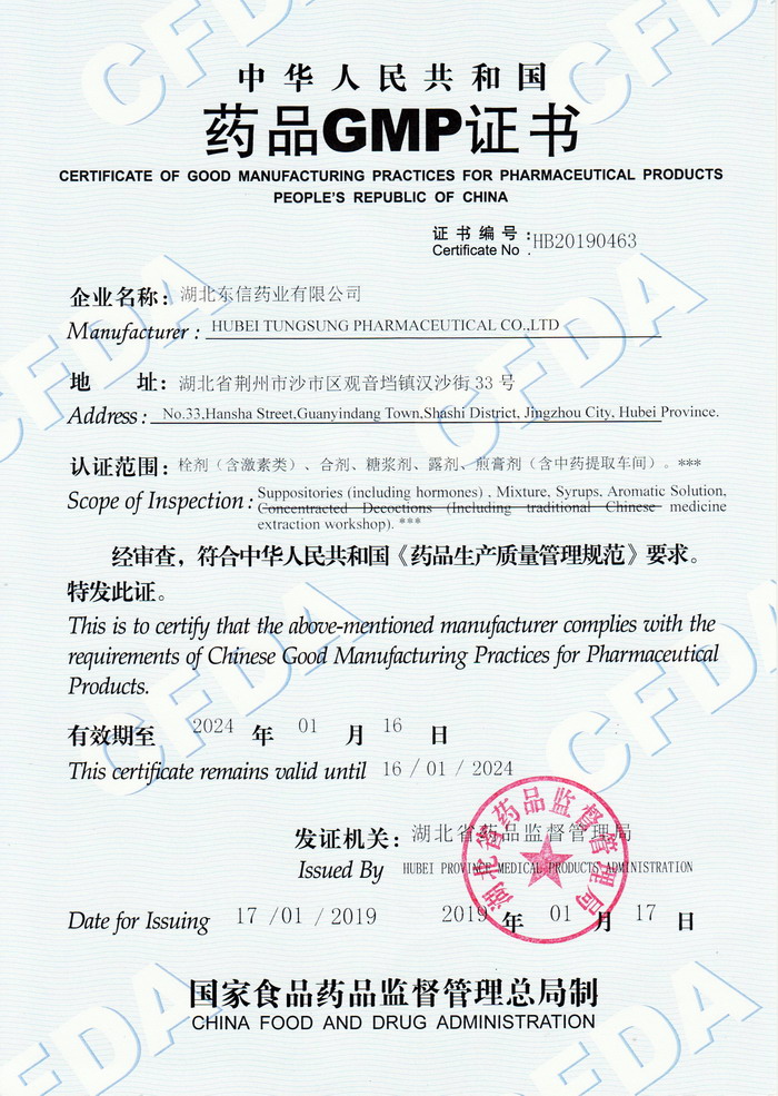 近日,a片漫画 通过湖北省药品监督管理局组织的专家组检查、审评,取得栓剂(含激素类)、合剂、糖浆剂、露剂、煎膏剂(含中药提取车间)《药品GMP证书》,有效期自2019年1月17日至2024年1月16日。