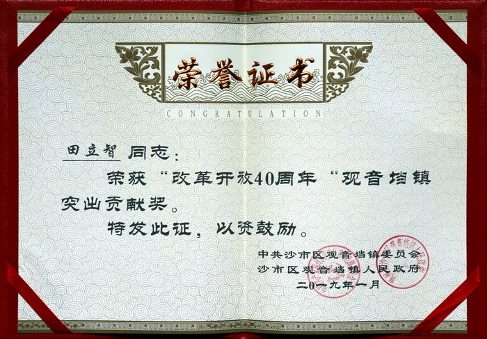 总经理田立智荣获观音垱镇“改革开放40周年”突出贡献奖