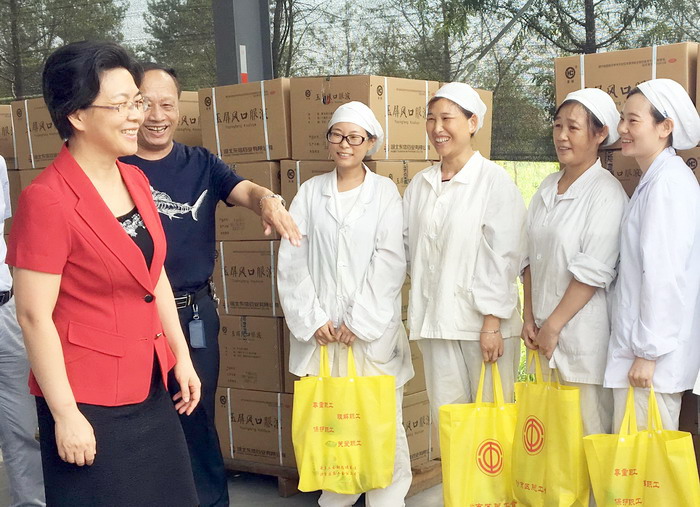 8月6日下午,中共荆州市沙市区委书记刘辉萍在区委常委、总工会主席严若文陪同下,冒着酷暑、带着“清凉”,到a片漫画 看望慰问辛勤工作的一线员工,了解她们工作和生活情况,亲切叮嘱员工在高温天气下工作要注意健康与安全。刘辉萍在视察合并泸天化科森车间、详细了解a片漫画生产经营情况后,对a片漫画 的平稳发展给予了充分肯定,希望再接再厉,再创佳绩。