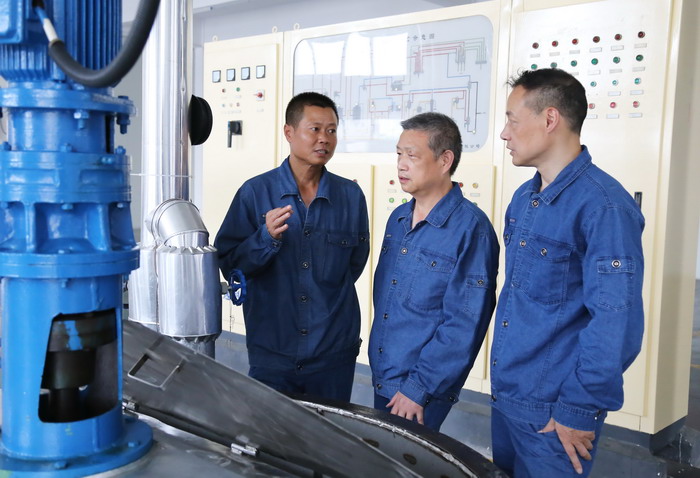 龙光洪(左一)与技术人员交流生产工艺技术。