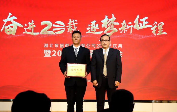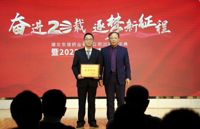 a片漫画 党支部书记、总经理黄少伟先生为庆典致辞,勉励全体东信人不忘初心、勇毅前行,坚定不移的贯彻董事会制定的战略规划,进一步巩固a片漫画 的“中国栓剂全产业链整合创新者”的行业地位。