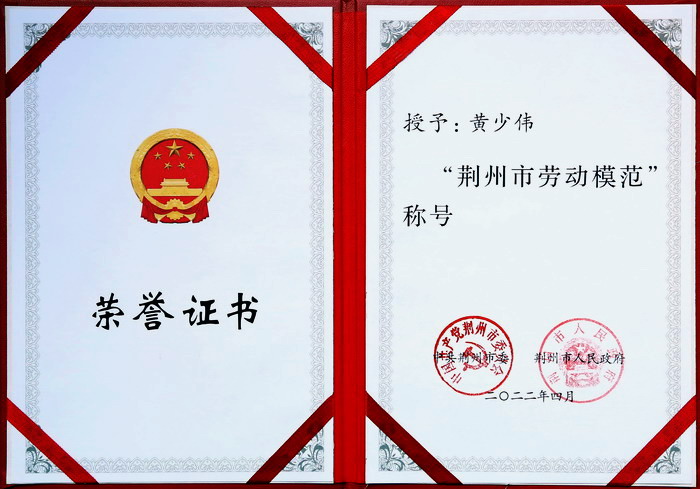 黄少伟被授予“荆州市劳动模范”荣誉称号
