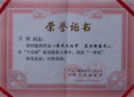 a片漫画 总经理助理兼办公室主任习俊在当地政府举办的第12届农民文化节活动中拍摄的作品《农民文化节 展示新农民》,在平安人寿荆州中心支a片漫画、荆州日报编辑部共同举办的“平安杯”新闻摄影大赛中,荣获“一等奖”。
