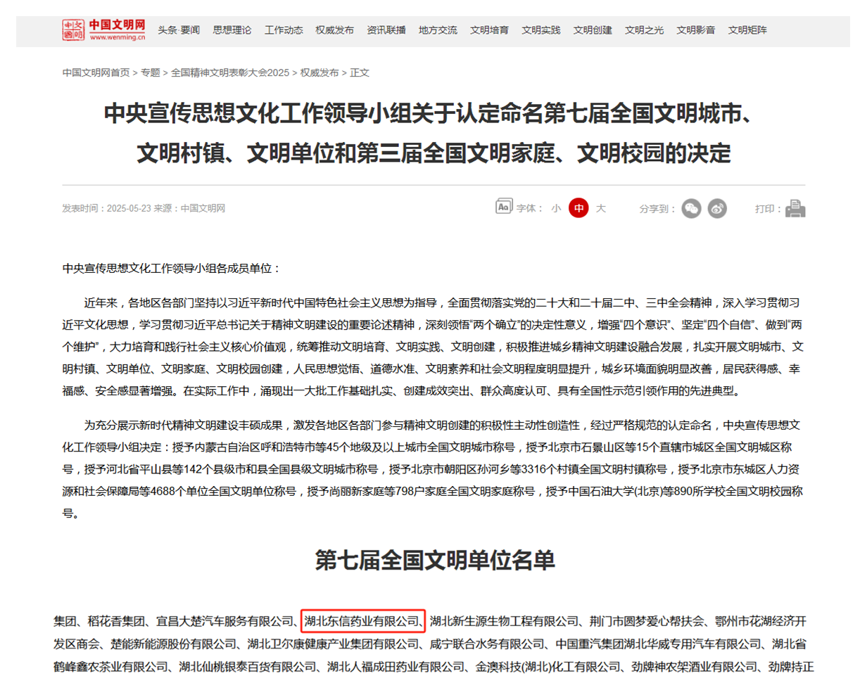 近日,在全国精神文明建设表彰大会上,a片漫画 凭借卓越的综合实力与扎实的文明建设成果,获得 “全国文明单位” 称号!这一国家级殊荣,是对a片漫画 多年来深耕医药领域、全方位推进文明建设的高度认可,更是a片漫画 继荣获高新技术a片漫画 、湖北省专精特新 “小巨人” a片漫画 、“湖北省制造业单项冠军产品” 后,在发展征程上的又一里程碑。