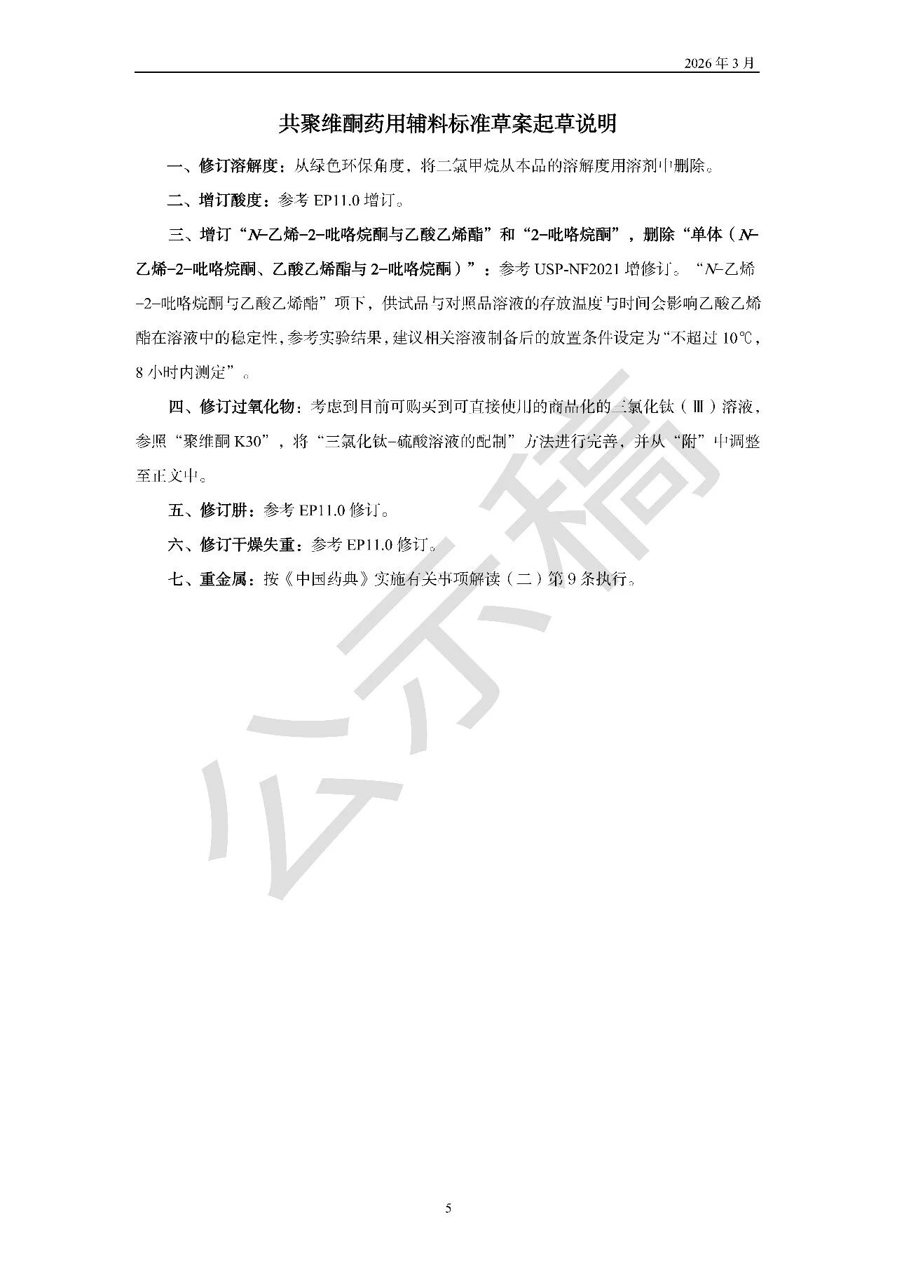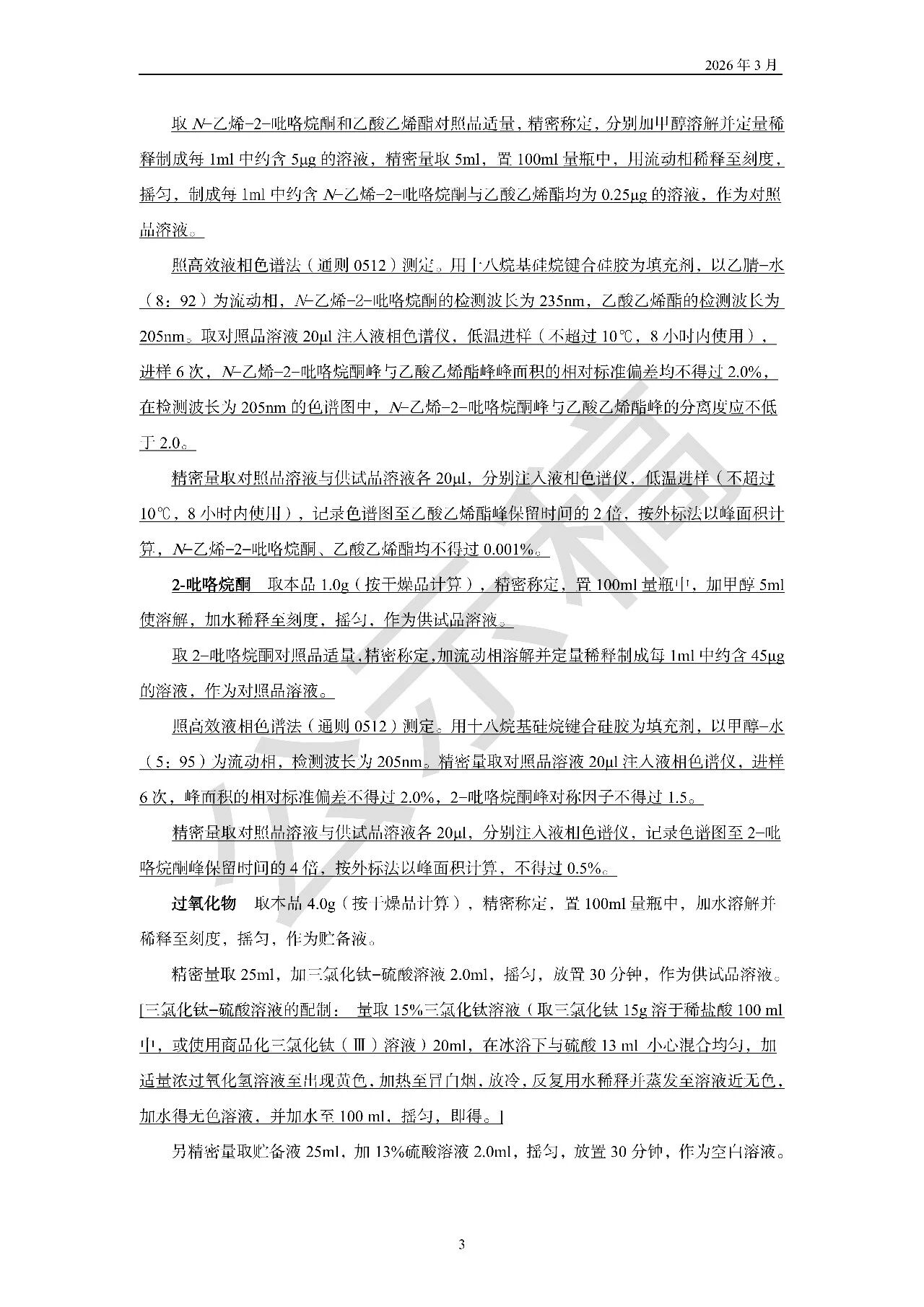 增订“N-乙烯-2-吡咯烷酮与乙酸乙烯酯”和“2-吡咯烷酮”,删除“单体(N-乙烯-2-吡咯烷酮、乙酸乙烯酯与2-吡咯烷酮)”:参考USP-NF2021增修订。“N-乙烯-2-吡咯烷酮与乙酸乙烯酯”项下,供试品与对照品溶液的存放温度与时间会影响乙酸乙烯酯在溶液中的稳定性,参考实验结果,建议相关溶液制备后的放置条件设定为“不超过10℃,8小时内测定”。